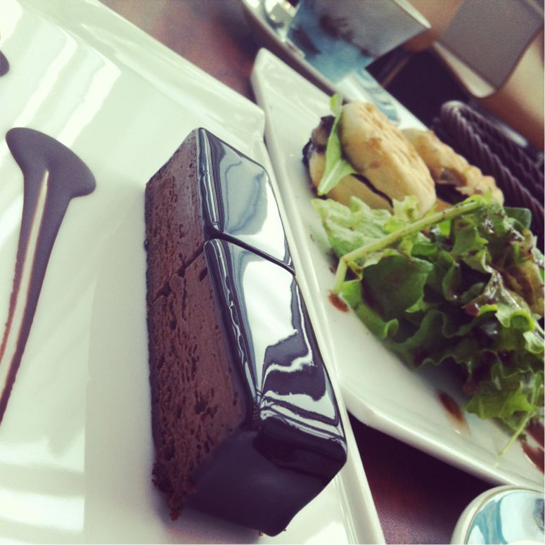 フォアグラのボカディージョとタルタグアランダ(生チョコケーキ)をシェア。どちらも美味だ。タルタグアランダは表面てかてか濃厚なのに、不思議にすっきりヌケ感があってくどくない(少量でいいけど)。