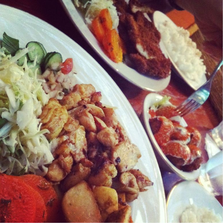 ファラフェル→ガルバンソーの団子を揚げたもの、は、ビーガン食品なのだけど、豆の甘味と香ばしさが美味。おからの仲間という感じがした。家で作れるだろうか。あとケバブと、シュニッツェル(レモン風味のチキンカツ、さくさく)。付け合わせの人参がハーブがきいていて美味。あとフレンチフライがさっくさく。セットの米の量が多い...単品ひとつ+セットひとつ注文してセットの飯をシェアすればよかった。