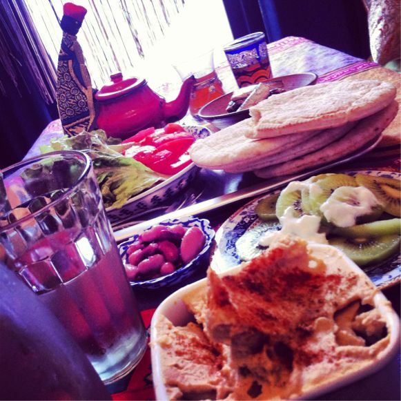 ピタを持ってきてくれたので、アラビヤン飯に。といってもまともに作ったのはフムスくらい。sみちゃん横から「普通のご家庭にクミンはない!」とか、ファサー効果音とかもこみちクラスタの本領発揮するから笑いすぎて缶で手を切って血まみれになった。ピタにレタス、トマト、フムス、オイルサーディン、豆。あとトルコチャイ(ミルク無しの)、キウイにヨーグルト。メニュは手抜きでもテーブルセットは楽しい。